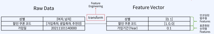 원본 Raw data를 Feature Engineering을 통해 가공하여 모델이 사용할 수 있는 Feature Vector로 변환합니다. 그 예시는 아래 그림과 같습니다. 이런 범주형 값들이나 숫자 배열을 모델이 알아먹게 바꾸어주어야 합니다.