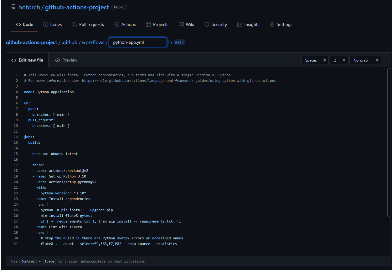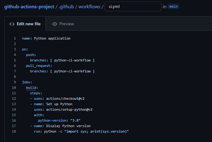 (전체적인 과정은 Start commit → Create a new branch.. → 이름을 'python-ci-workflow' 로 변경 → Create pull request 입니다. )