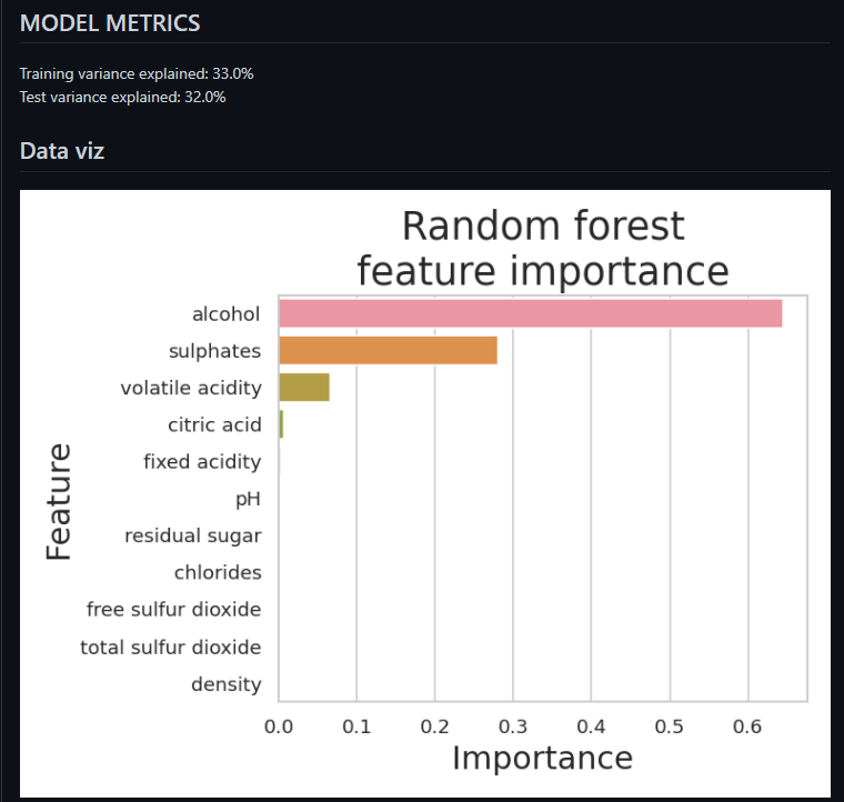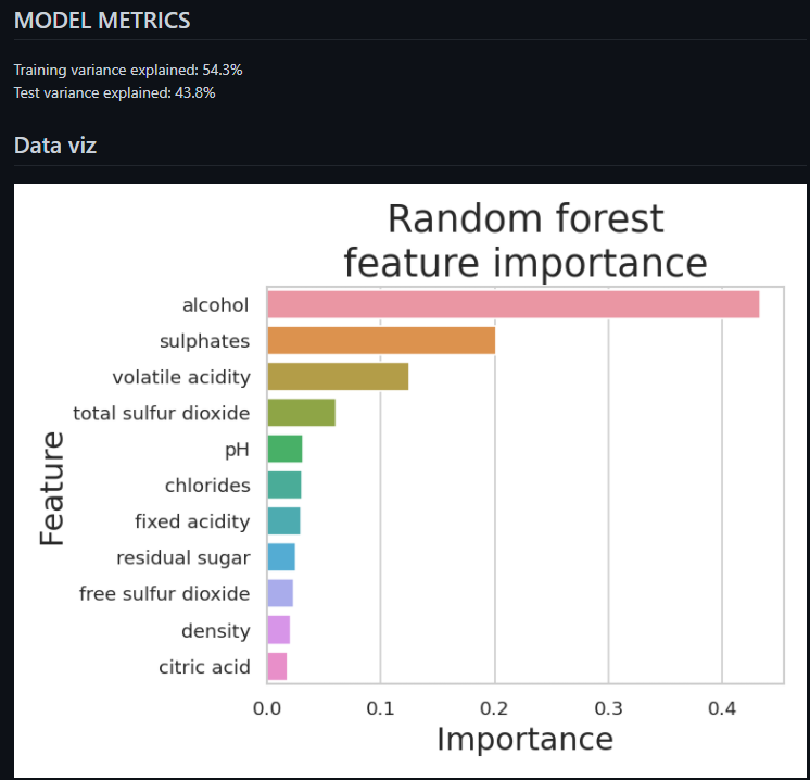 여기서 분석 코드를 변경하고, Commit을 변경하고 다시 Build를 해보겠습니다. train.py에서 max_depth parameter를 2에서 5로 바꾸고 다시 시도합니다. 중요도 부분에서 조금 다른 형태가 나옴을 알 수있고, 설명력 부분 값들도 바뀐 것을 알 수 있습니다.