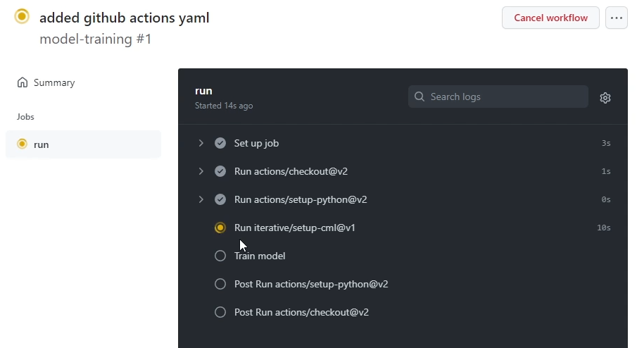 추가로 yml 파일 하나를 생성하겠습니다. 경로는. github/workflows/cml.yml로 하겠습니다. 그 후 새로운 브랜치를 만들어서 commit 후 build 하겠습니다. (들여 쓰기를 주의하시길 바랍니다.)