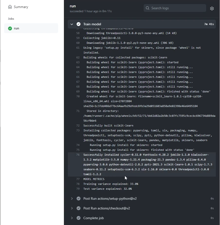 수행 후 한번 Train Model 부분을 한번 확인해보겠습니다. 아래쪽에 설명력 부분이 print 되는 것을 확인할 수 있습니다.