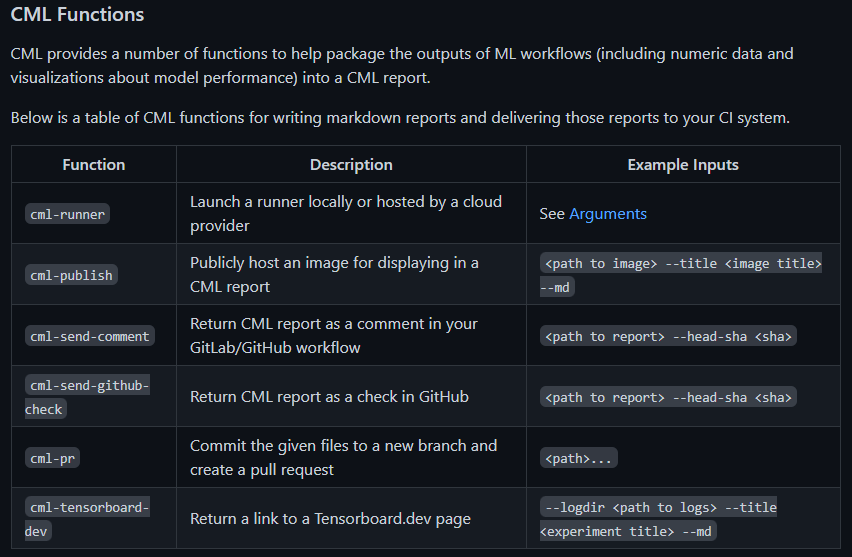 CML은 데이터 사이언스 프로젝트를 지속적으로 통합시키기 위한 오픈소스입니다. 아래는 cml functions입니다.