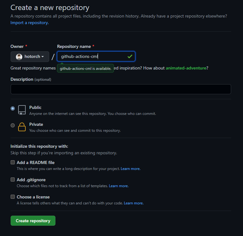 우선 github-actions-cml 새 repo를 준비해둡니다.