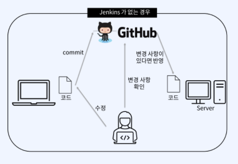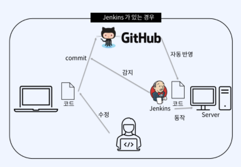 Jenkins가 있으면 코드 수정하고 Commit을 하면 Jenkins가 이를 감지해, 서버에 있는 코드를 반영하고(Commit에 따른 자동빌드), 이 뿐만 아니라 서버 내의 코드의 특정 부분만을 반영하거나 동작(자동 테스팅)하게도 할 수 있습니다.