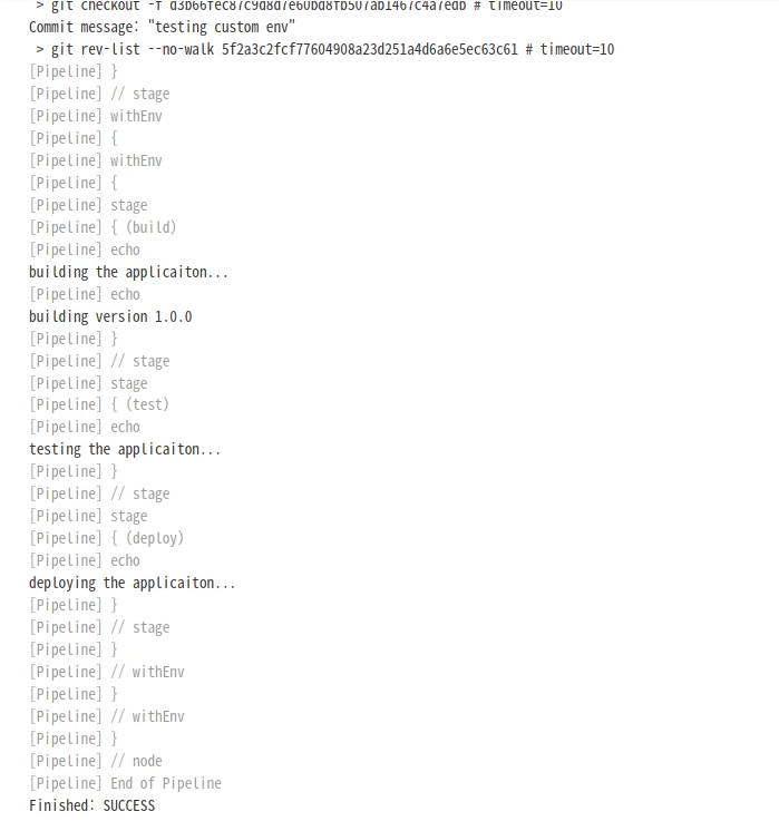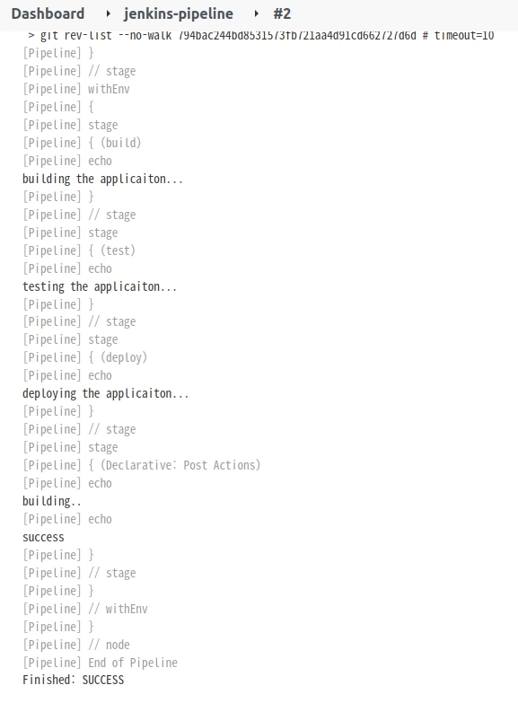 log를 보면 Building ~, testing ~ , deploying ~ 이런 식으로 jenkinsfile에 있는 echo 부분이 잘 구현되면서 success라는 문구가 뜨는 것을 확인할 수 있습니다. build가 성공했다는 뜻입니다.