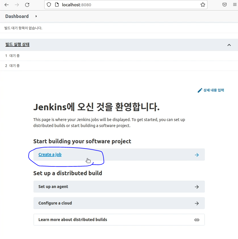 이제 localhost:8080 jenkins를 접속해서 시작해보겠습니다. create job을 누릅니다.