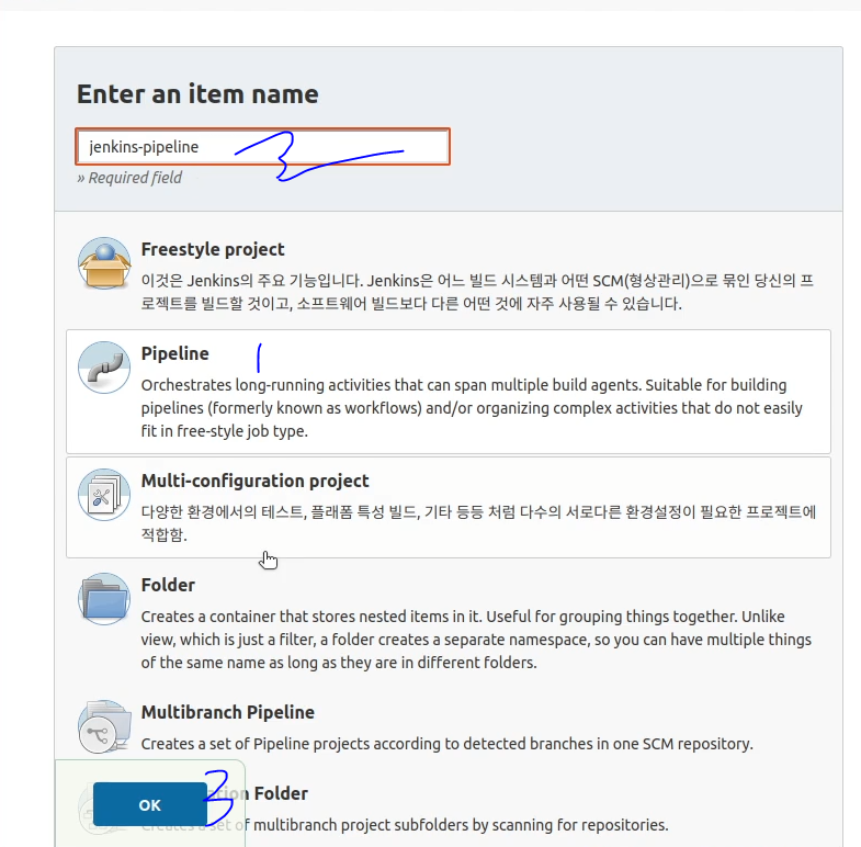 Pipeline을 생성하는데, 이름은 jenknins-pipeline으로 입력하겠습니다.