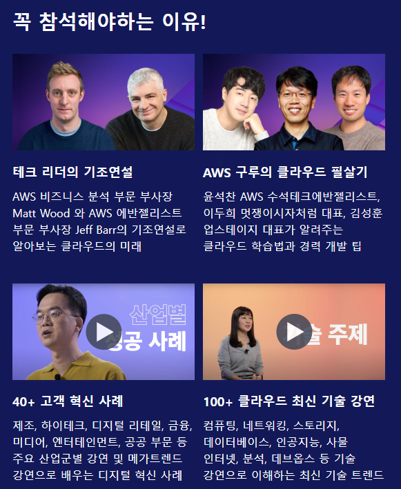 발표하시는 분들 라인업을 보면 딥러닝 하면 무조건 알 수밖에 없는 성킴 교수님과 메타콩즈 NFT에서 또 핫한 이두희 대표님도 있는 것을 알 수 있습니다. 아마존 부사장님 Jeff Barr 연설도 있음을 알 수 있었습니다. (Jeff Barr은 아마존에서 오랫동안 근무하면서 2004년부터 블로그 글을 작성하여 글이 몇 천 개 있을 정도로 상당히 유명합니다.) 그 이외에도 수많은 기업들이 발표하는 것을 알 수 있습니다.