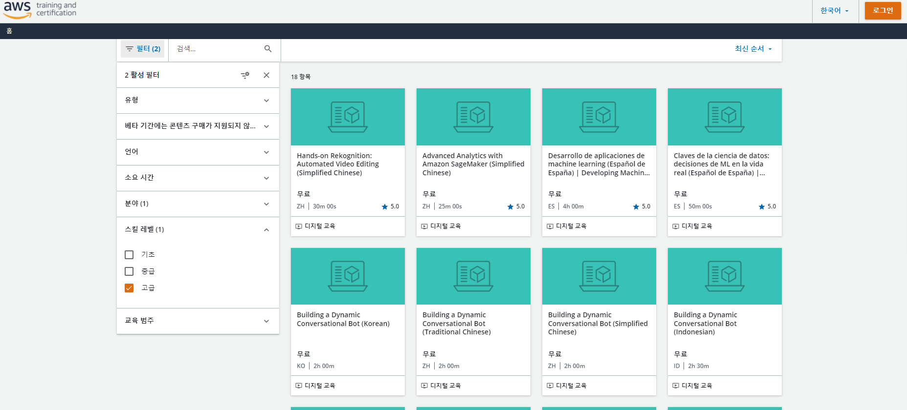 사이트에 접속하면 좌측에 필터 조건을 통해서 관심분야(도메인), 언어, 시간 등을 선택하여 교육영상을 들을 수 있습니다.