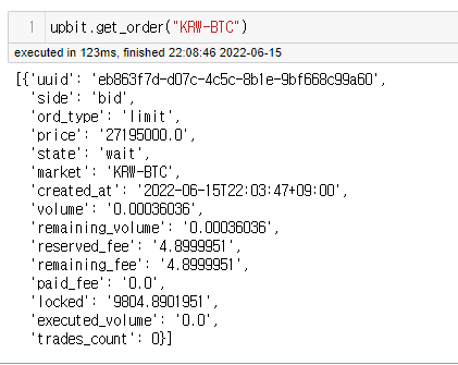 Run 하면 미체결된 주문 id와 각종 정보(가격, ticker, 수량 등)가 있음을 알 수 있습니다. 비트코인을 0.00036036개만큼 현재가보다 2% 싸게 주문을 넣었다는 뜻입니다.