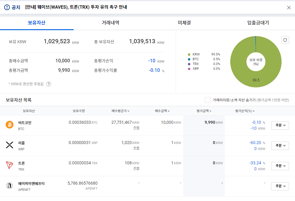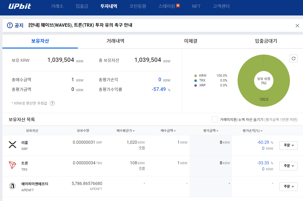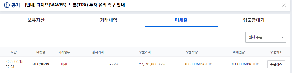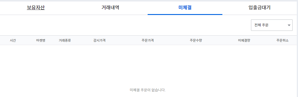 미체결된 주문이 사라진 것을 알 수 있습니다.