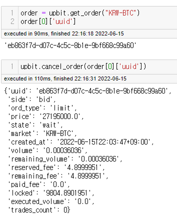 취소를 하기 위해서는 id가 필요합니다. 그래서 다음과 같이 수행합니다. 주문한 코인이 1개뿐이라서 index를 지정하였습니다. 추후에 전체 취소하려면 나중에 주문한 것만큼 loop를 돌며 취소하면 될 것 같습니다.