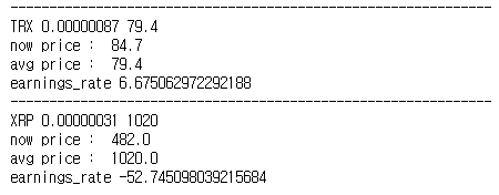 현재 가격에서 보유한 평단가를 뺀 다음, 평단가로 나누면 수익률이 나타납니다. 원화를 제외를 하여 현재 코인 가격을 읽은 다음 보유한 평단가를 가져와 계산을 하면 됩니다. 보유한 코인들에 대해 보유수량, 평단가, 현재가, 평단가, 수익률을 전부 조회 하는 내용입니다. 자세한 내용은 아래 주석을 참고하면 되겠습니다.