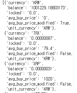 아래처럼 원화가 100만원 정도 있는 것을 알 수 있고, 보유한 다른 코인들도 알 수 있습니다. list 안에 dictionary 형태로 있음을 알 수 있습니다. balance는 보유수량이고, avg_but_price는 평단가 입니다.