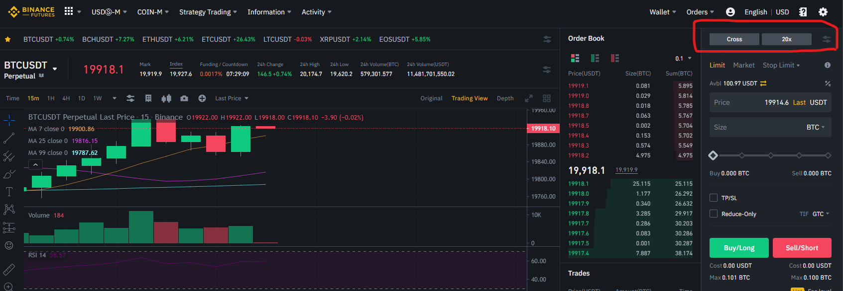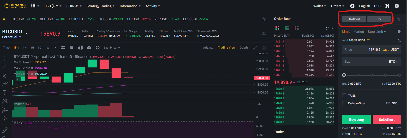 아래 그림에서 우측 상단에 붉은 색으로 쳐둔 부분이 격리 유무와 레버리지 배율을 조정할 수 있는 부분입니다. 격리 종류로는 Cross(교차), Isolated(격리) 두 종류가 있습니다. 간단히 두 방법에 대한 차이는 Cross(교차) 모드는 들고 있는 예수금까지 전부 담보로 잡히기 때문에 진입한 포지션 이상으로 반대방향으로 매매가 되는 경우 예수금까지 청산을 당할 수 있는 위험을 가지고 있습니다. Isolated(격리) 모드는 포지션 잡은 금액만큼만 청산이 되는 경우입니다. 만약에 100$ 중에 10$만큼 롱으로 100배 포지션을 잡았다고 했을 때 1% 떨어지면 포지션을 잡은 10$만큼 청산을 당합니다.