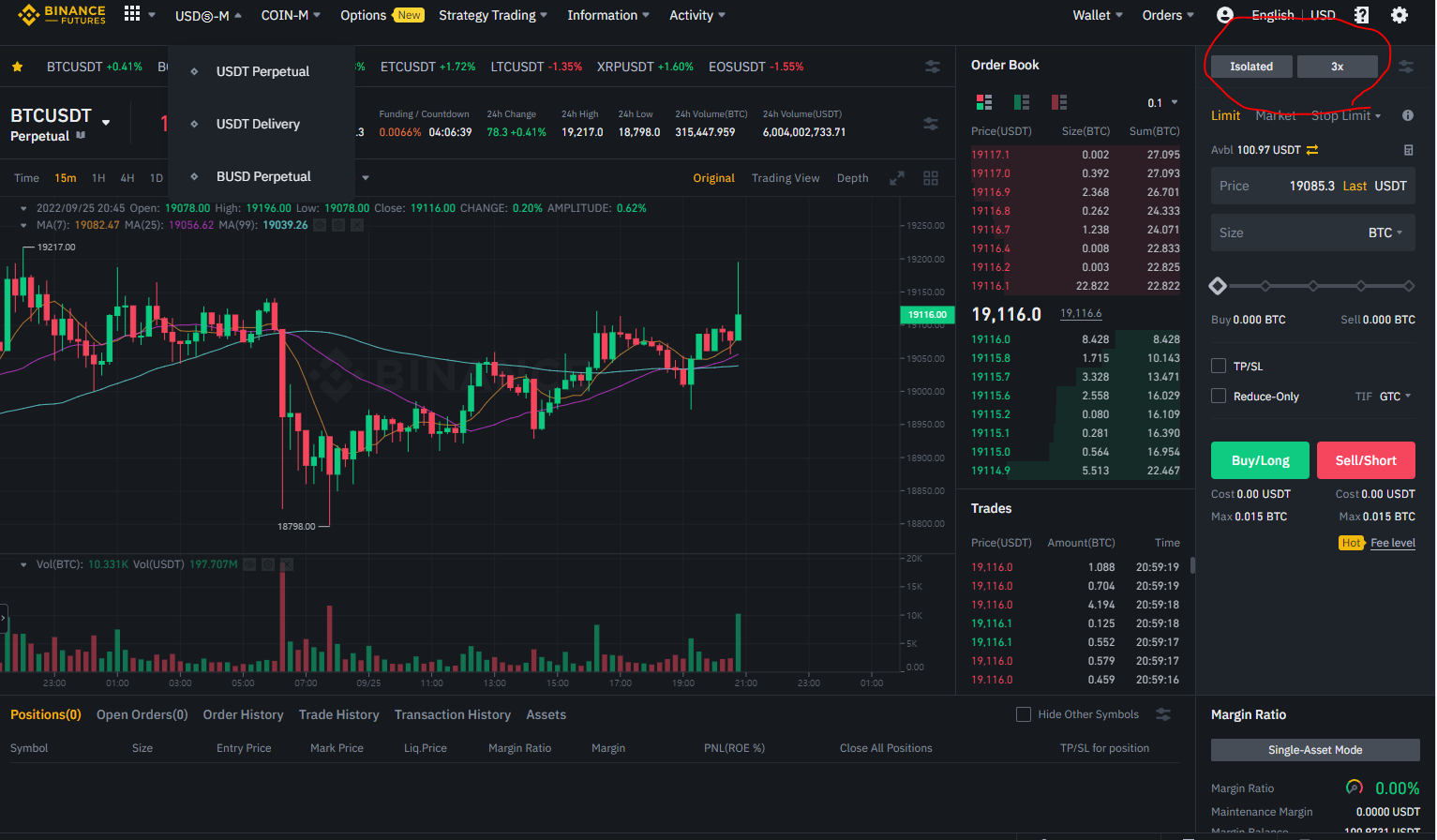 이전 글에 있었던 코드를 바탕으로 아래와 같이 시작합니다. 레버리지 배율은 3배로 하고, isolated 상태로 지정합니다.
