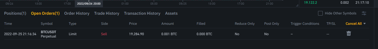 수행하는 즉시 Open Orders 탭을 누르면 진입가격(19,094k)에서 1.01배 높은 19,284k에 sell 주문이 정확하게 들어간 것을 알 수 있습니다.