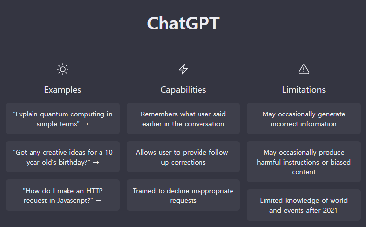 안내사항 이후에는 메인 페이지에 Examples, Capabilities, Limitations가 나타납니다. Capabilities에서 제시하는 내용은 이전 대화내용이 언어모델 특성상 이어지게 반영이 되게 하였으며 부적절한 요청에 대해서는 거부하도록 학습이 되어있다고 합니다. Limitation에서 주의 깊게 봐야 할 점은 2021년 이후의 세계, 사건에 대해서는 제한된 지식을 가지고 있다고 합니다.