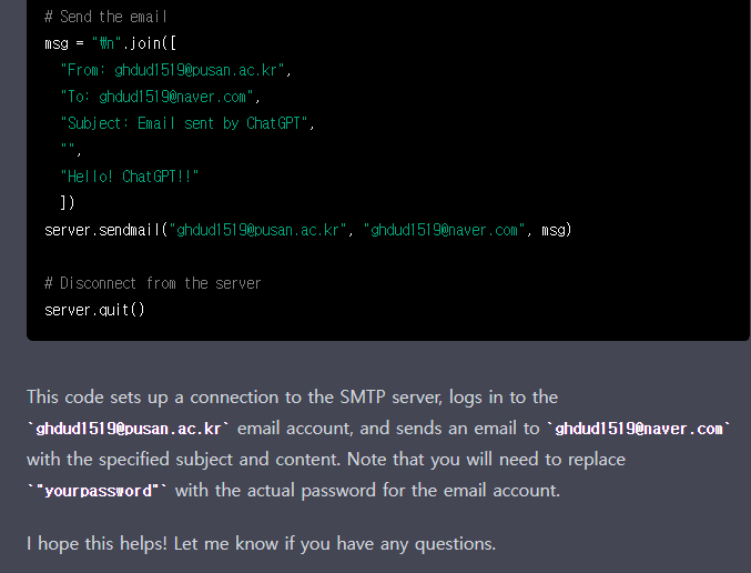 결과는 다음과 같습니다. 어떤 library를 사용하면 되고, 어떻게 쓰면 된다고 설명해 주었습니다. 실은 이것을 제대로 하려면 보내는 사람 gmail에 특정 세팅을 사전에 바꾸어 주어야 하는 귀찮음이 존재하는데, 아래처럼 수행하면 메일을 보낼 수 있습니다.