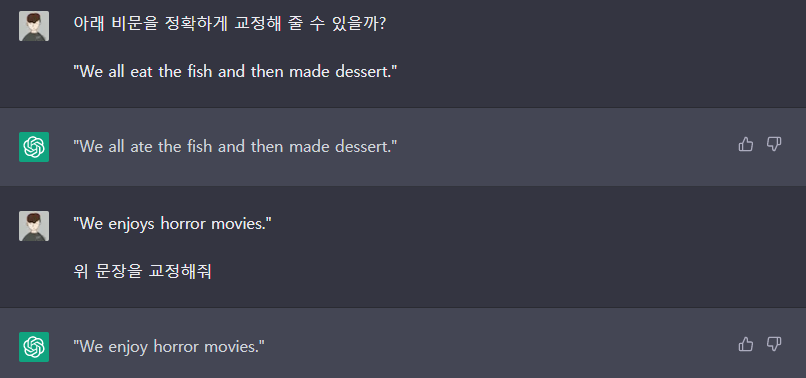 또 다르게 문법을 물어보는 문제를 물어보았을 때, 정답을 이야기합니다. 답을 선택한 이유가 문법적으로 지적을 해준다면 소름이 돋을 것 같습니다.
