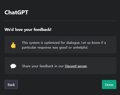 위에 로그인 절차가 끝나면 아래와 같이 접속이 된 것을 확인이 가능합니다. 안내사항들이 제시되는데, 아래 문장은 시스템이 간혹 부정확하거나 오해의 소지(모델이 가지고 있는 편향된 정보)가 있는 정보를 생성할 수 있는데, advice로 받아들이지 말라고 이야길 합니다. 또한 민감한 정보를 공유하지 말아 달라고 하며 피드백은 디스코드로 받고 있음을 알 수 있습니다.