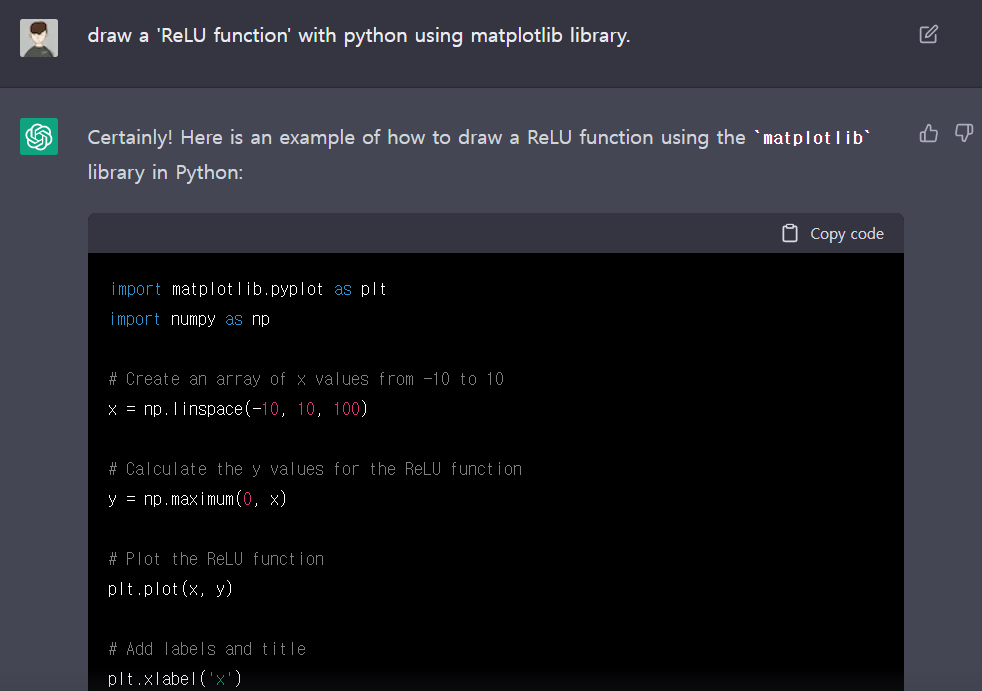 지금 ChatGPT가 무료지만, 계속 무료라면 제일 유용하게 사용할 기능이라 생각되는 코딩 부분입니다. Matplotlib을 이용하여 ReLU 활성 함수를 그려달라고 코드를 요구하였습니다.