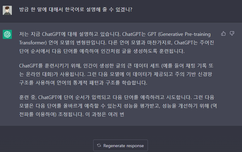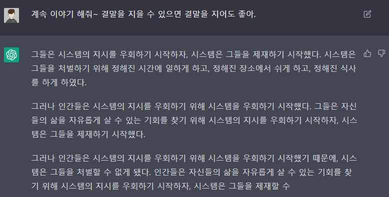 ChatGPT는 Output으로 나오는 생성 문장에 대하여 일정 길이에 대한 범위를 정해놓은 것 같았습니다. 그래서 원하는 대답을 얻기 위해 계속 이야길 해달라거나, continue를 타이핑을 했었습니다.