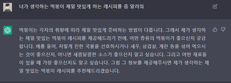 떡볶이를 좋아하므로 레시피를 요청해 보겠습니다. 또한 조금 색다른 요구사항을 더해보았습니다.
