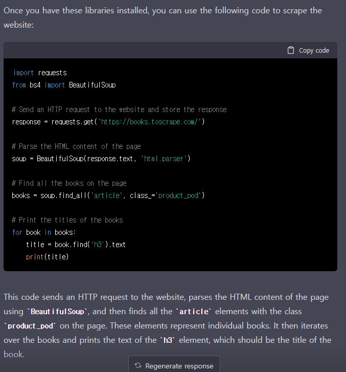 간단하게 크롤링을 할 수 있는 코드도 제시해 줍니다. 제가 준비한 질의 쿼리는 다음과 같습니다.