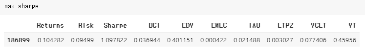 추후에 더 자세히 설명할 예정이지만, BCI부터 VT까지의 비중을 가지고 10년 동안 Hold 했을 때 최대 9%(Risk)까지 떨어진 적이 있었고, 매년 10.42%(Returns) 수익을 얻을 수 있다는 뜻입니다. Sharpe는 샤프 비(Sharpe Ratio)라고 부르며 간단하게 설명하면 리스크 대비 수익률입니다. (개인적으로 좋아하는 지표이지만, 이 지표에 대한 설명과 허점은 추후에 알려드리도록 하겠습니다.) 9%의 리스크는 충분히 질 만한 리스크라 판단되며, 아마 저도 은퇴 시점에서는 운용 금액이 커져있을 때에는 이런 전략을 가지고 지낼 것 같습니다.