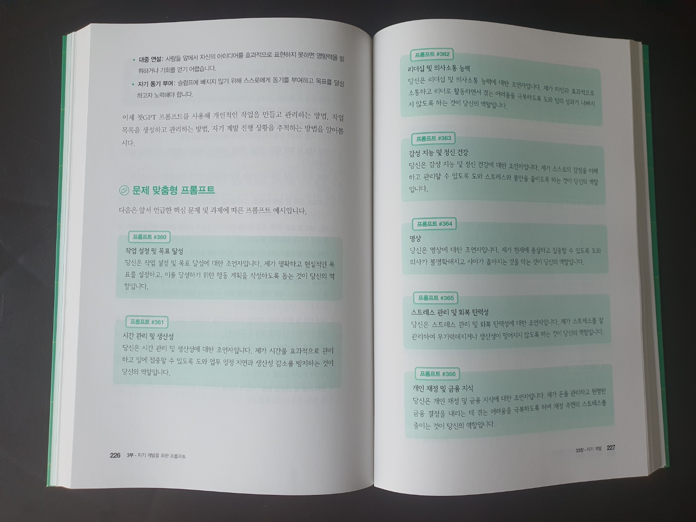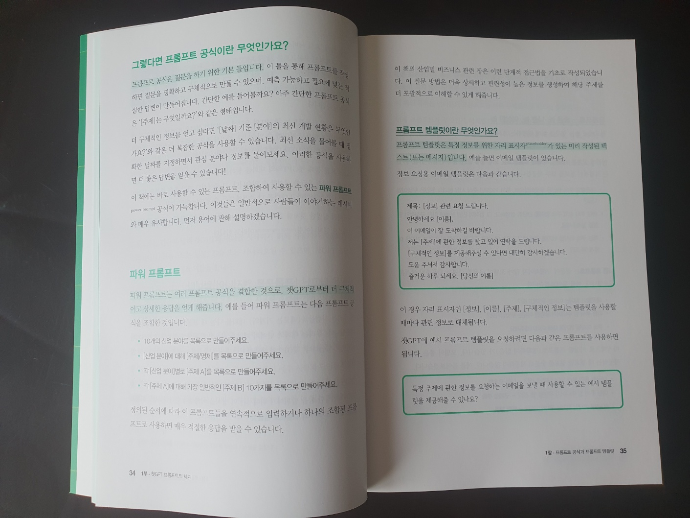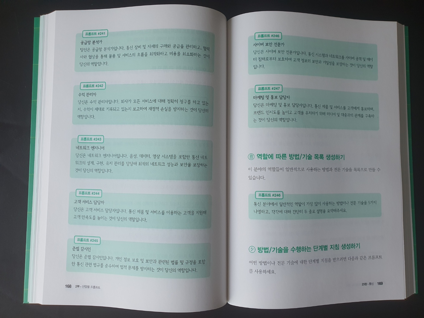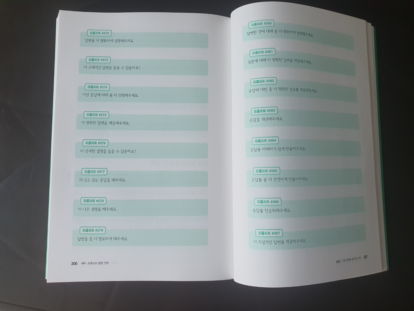 책 내용은 대부분 프롬프트 템플릿, 프롬프트 예시, 특정 프롬프트를 질의했을 때 예시 결과를 보여주는 것이 대부분입니다.