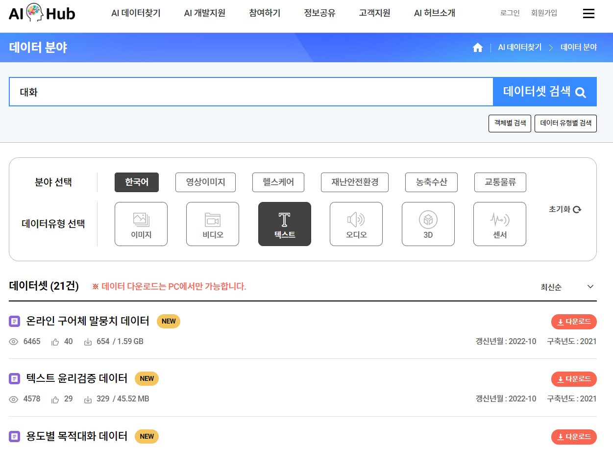 세번쨰로는 AI Hub 입니다. 가입하고 쉽게 다운로드하여 활용할 수 있습니다. 아래 그림과 같이 목적에 맞는 데이터 검색하여 찾아서도 볼 수 있습니다.