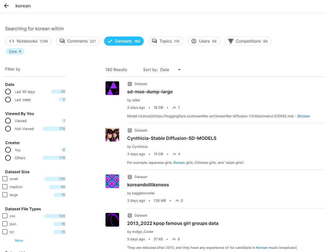 네번째로는 예측 모델 및 분석 대회 플랫폼으로 많이 알려진 Kaggle(캐글)입니다. 경진대회 code 및 노트북, Discussion 뿐만 아니라 5~6년 전부터 캐글 쪽에서도 데이터 셋을 공유할 수 있게 되었습니다. 아래 사진은 'korean'이라고 검색했을 때 결과입니다.