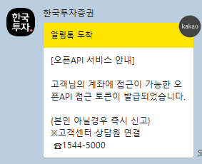 위 코드가 정상적으로 수행했다면 아래와 같은 카톡이 오게됩니다.