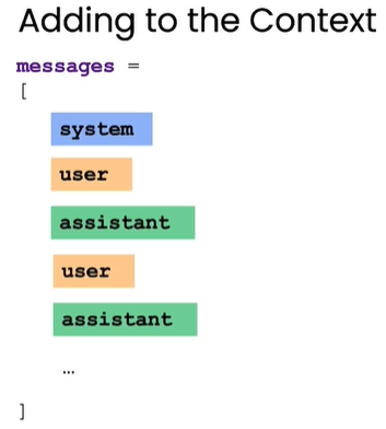 - 이전까지 내용은 질문을 던지면 답변 하나를 받았지만, Chatbot에서의 message input은 어떻게 다르게 넣어야 하는지 설명해 줌(system, assistant, user)