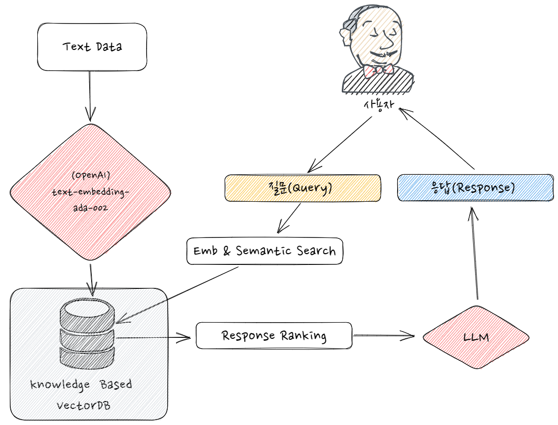 그래서 이를 해결하기 위해서 임베딩 모델 한 번만 태우고, 이를 적재하고 빠르게 읽어오기 위해 Vector Database를 활용합니다. (아래 그림을 langchain과 Vector Database를 결합한 예시입니다)