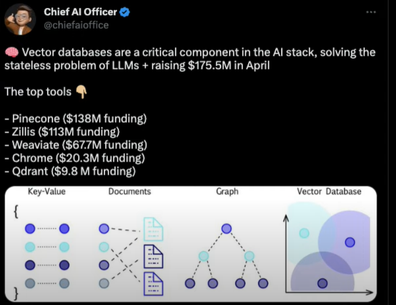 심지어 새롭게 뜨고 있는 Vector Database들에 대해서는 투자 금액이 쏠리고 있습니다. 참고로 Chief AI Officer의 트위터에서 4월 말 기준 투자 금액 기준으로 Top tools를 소개하면 다음과 같습니다.