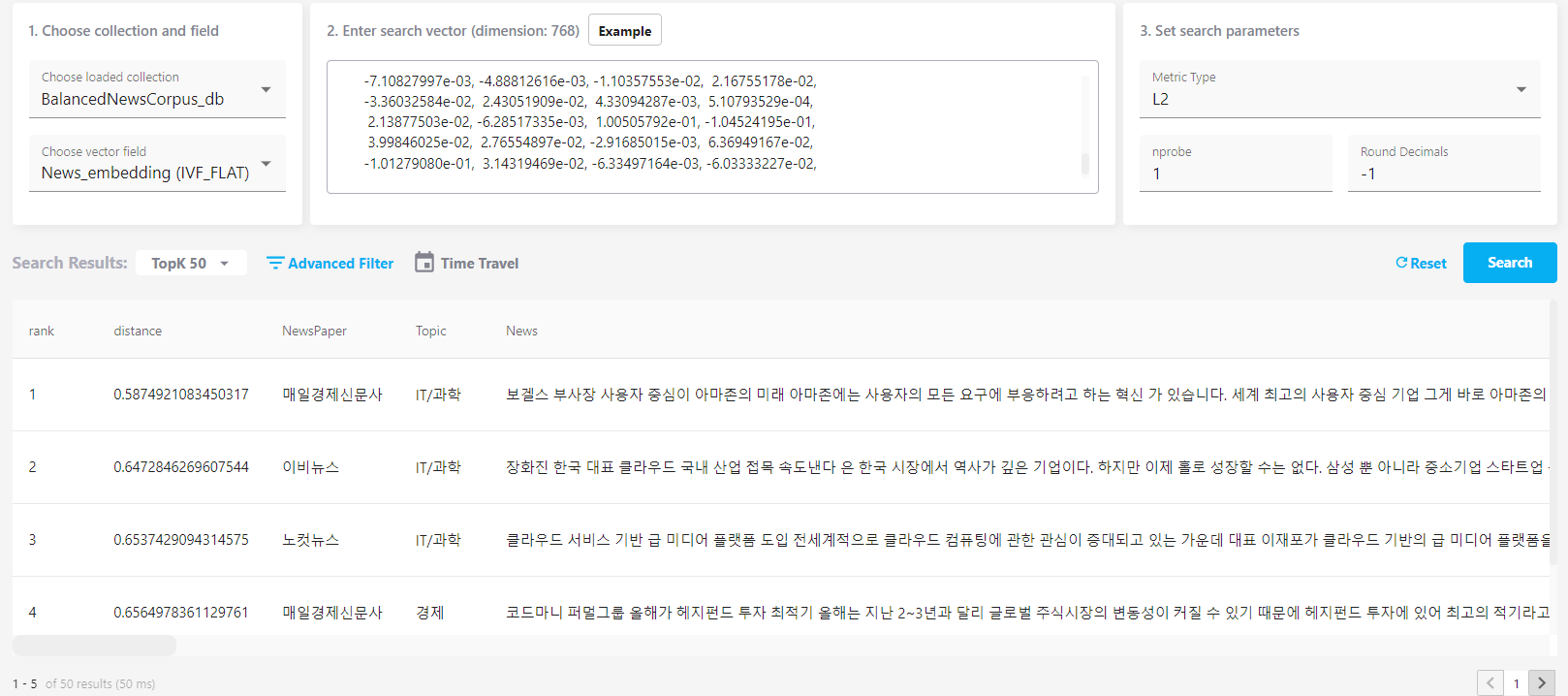collection과 임베딩 field, 그리고 search parameter(L2, IP 등)을 세팅하고 가운데에 Vector 값을 list 형태로 밀어 넣으면 검색이 됩니다.