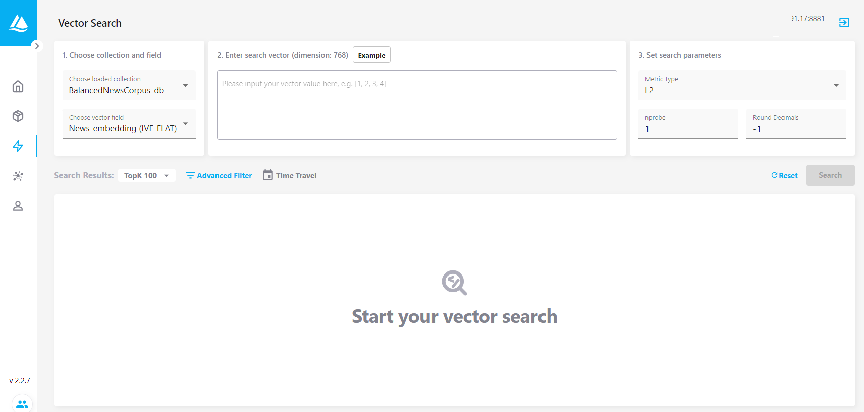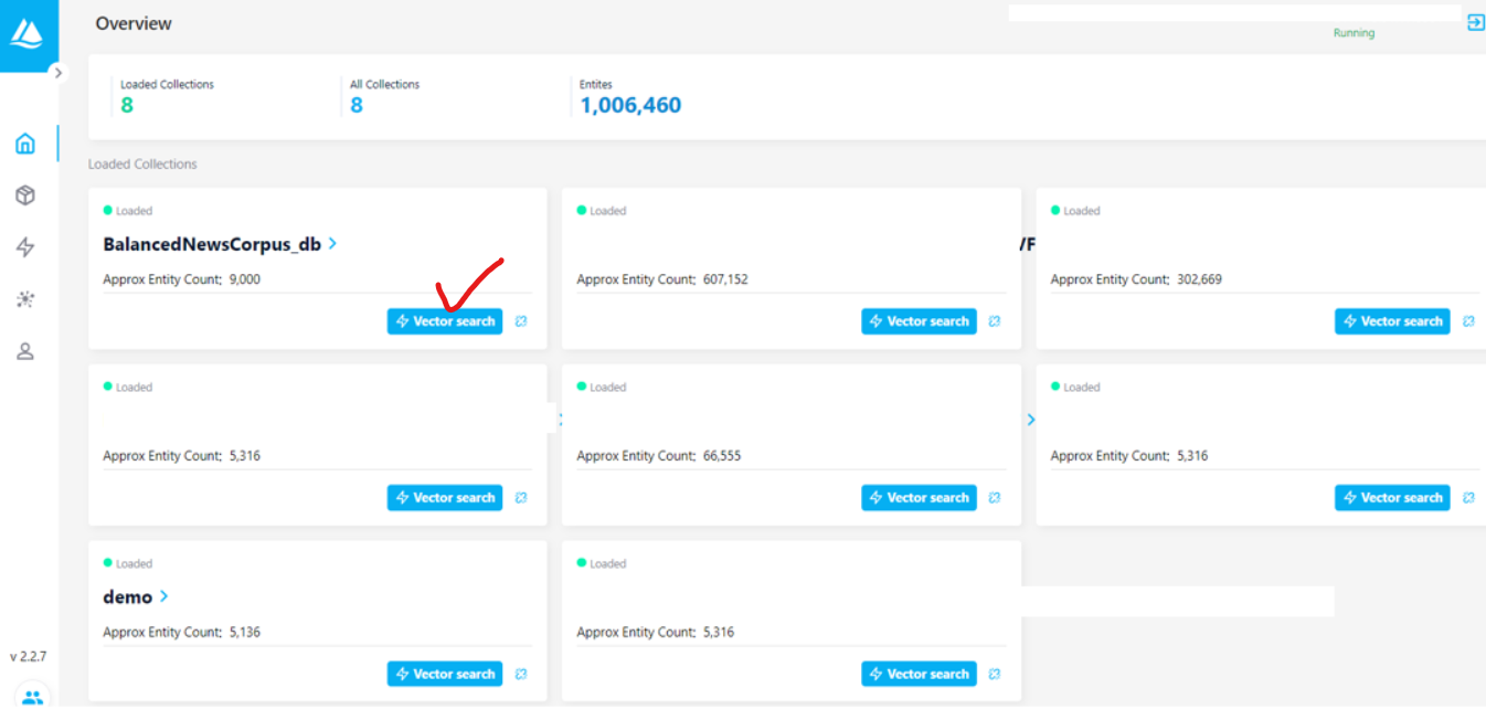 개발하시는 사람들은 GUI에서 잘 사용하지 않지만, Milvus GUI인 Attu 위에서 마찬가지로 Vector 검색이 가능합니다. load 된 collection 중에 사용할 collection의 vector search를 누릅니다.