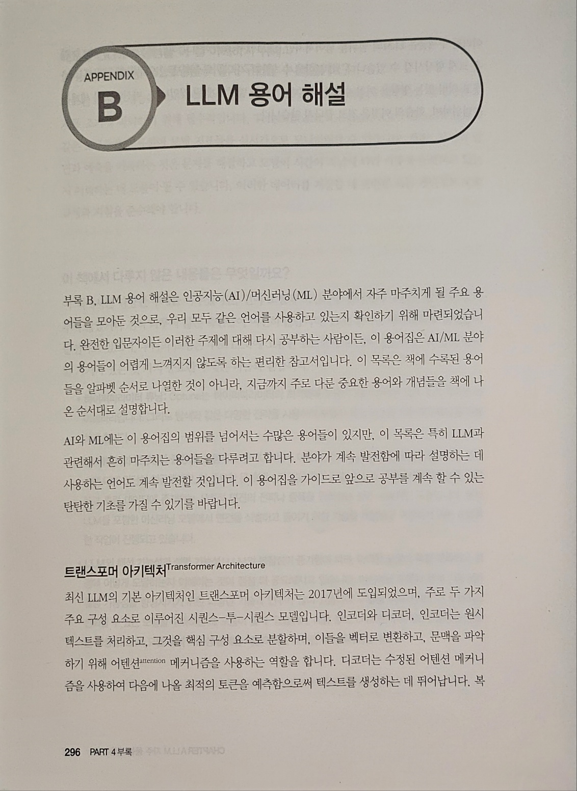 LLM 관련된 자주 묻는 질문 FAQ을 부록에 정리하고, LLM 용어 해설 또한 부록에 정리가 되어있어 글을 읽다가 부록을 살펴보면서 이해하기 쉽고 친절한 책으로 구성되어 있습니다.