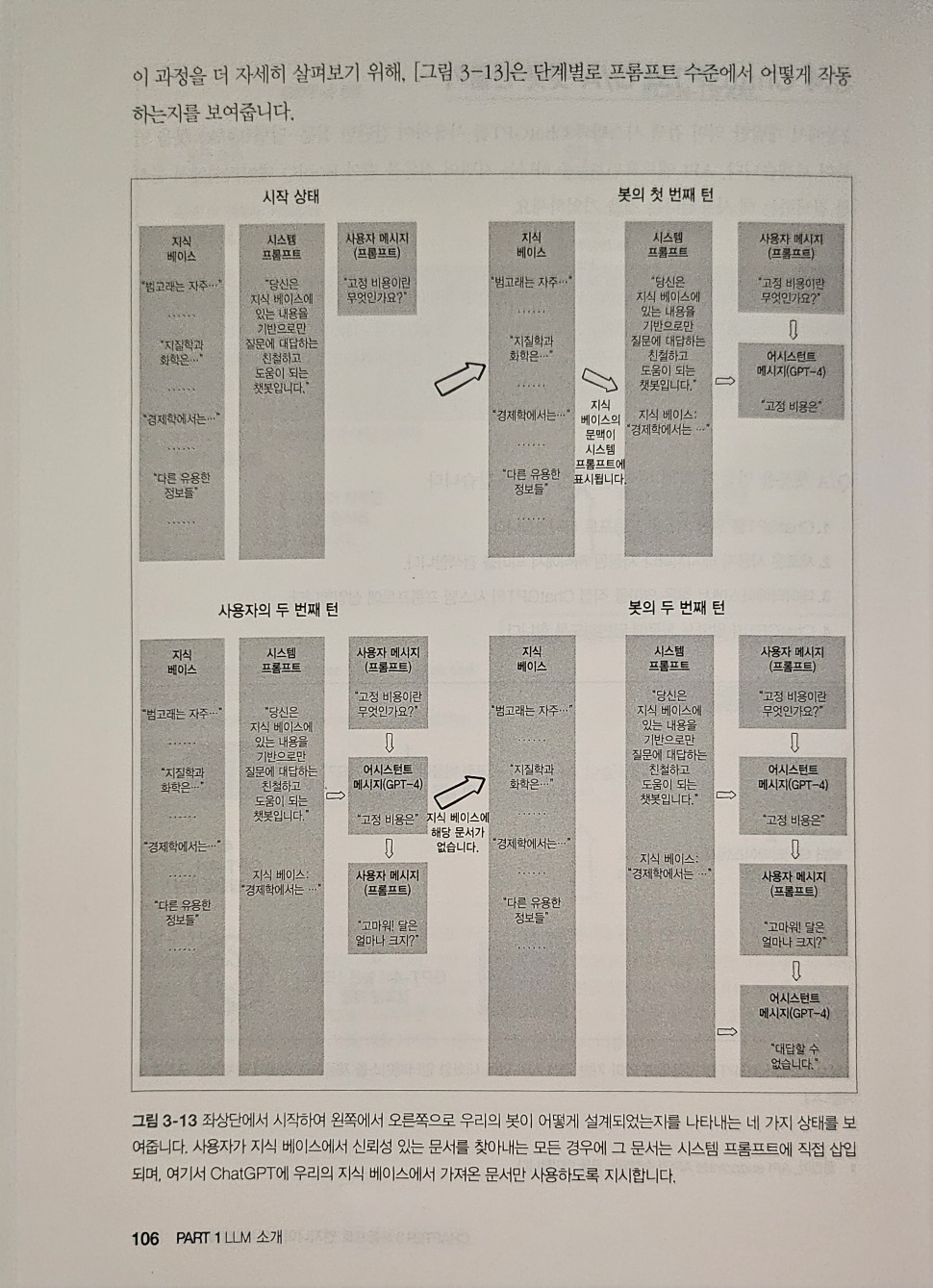 이 책이 참 좋은 것이 기획이나 문제 정의 부분에 대해서 쉽게 도식화를 해서 설명해 줍니다. 위 그림은 ChatGPT와 QA Chatbot을 만드는 과정과 만들기 위해 해야 할 일을 설명하는 내용입니다.