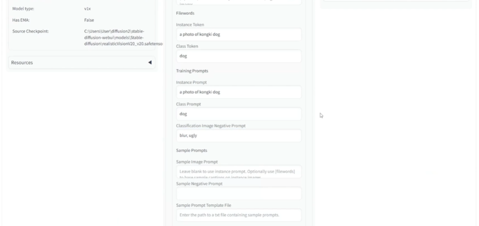 - 아래 Instance Token에 학습 데이터의 고유 명사를 지정해 주고 Class Token에는 학습 데이터의 카테고리를 정해줍니다. 만약 강아지 사진이면 dog, 인물 사진이면 person처럼 지정해 주시면 됩니다.
