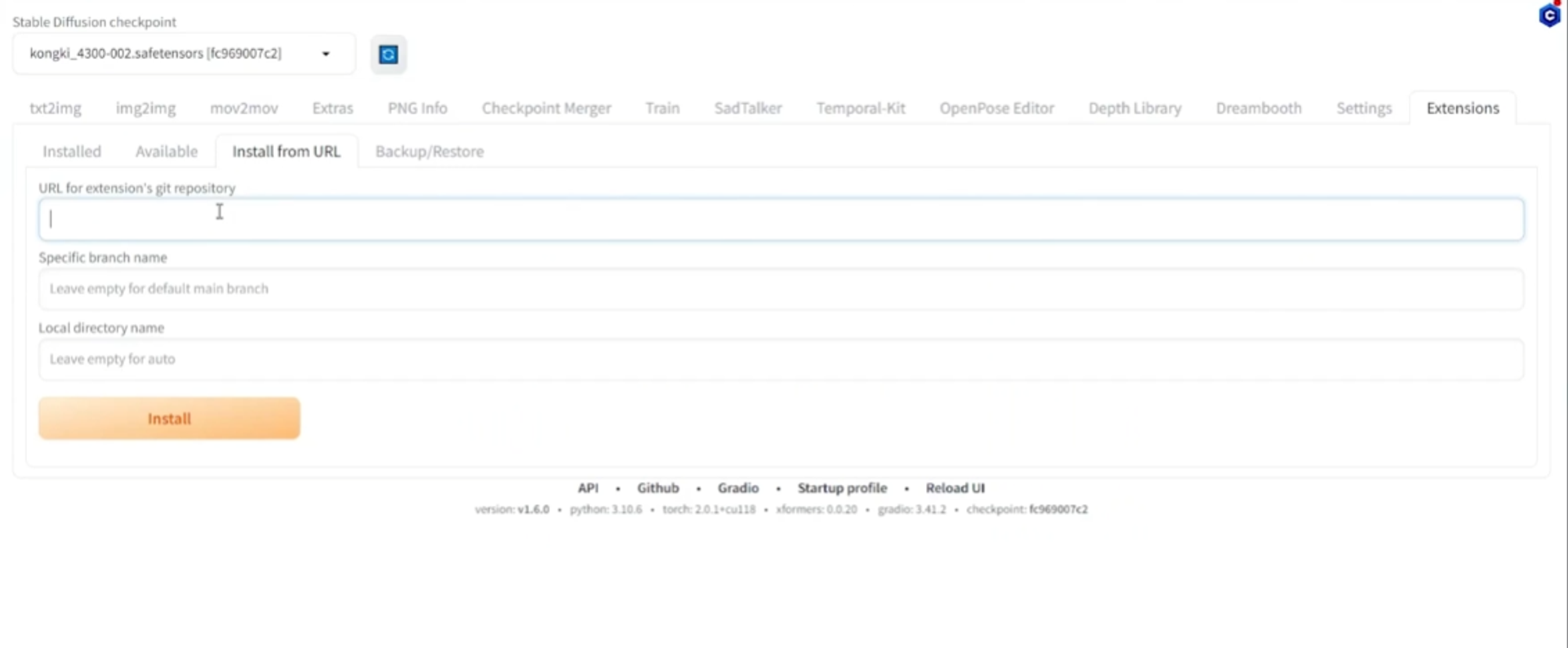 - Install from URL 탭을 클릭하고, URL for extention’s git repository에 https://github.com/d8ahazard/sd_dreambooth_extension 을입력하고 Install 버튼을 클릭합니다.