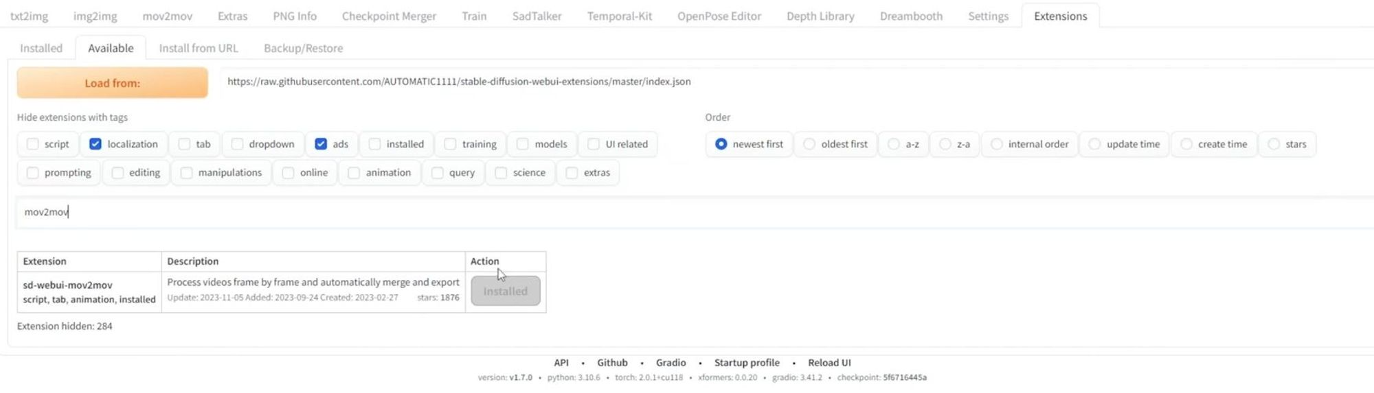 - 검색창에 animated를 검색하셔서 animatediff를 설치합니다.