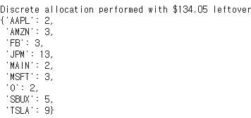 애플을 2주 매수, 아마존을 3주 매수하는 식으로 위의 dictionary 결과만큼 구성하면 134달러가 예수금으로 남는다는 뜻입니다.