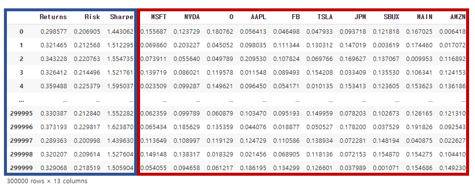 30만 개의 포트폴리오에 대한 수익률, 변동성의 기댓값, 가중치, Sharpe Ratio들이 list에 저장이 됩니다. 이제 pandas를 이용해서 정보들을 데이터프레임에 아래처럼 적재를 합니다.