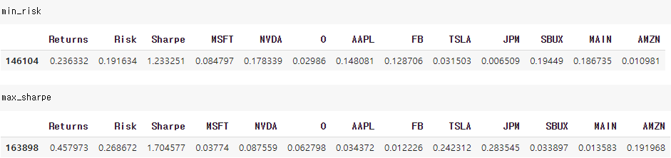 max_sharpe = df.loc[df['Sharpe'] == df['Sharpe'].max()] # ⓑ