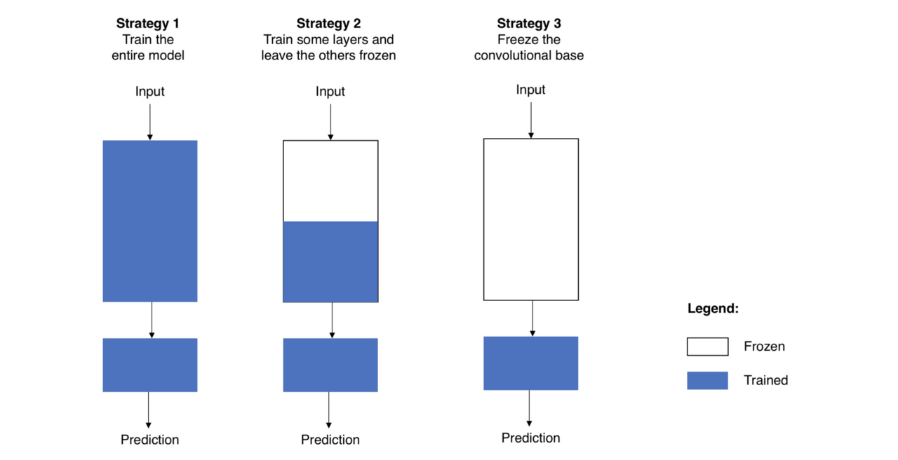 첫째는 전체 weights를 활용하는 것입니다. 전부 새로 학습시키는 방법이라고 생각하시면 됩니다. 두 번째는 본인 상황에 맞게 파라미터들을 활용하는 것입니다. 데이터셋이 작고, 파라미터가 많아 무거운 경우에는 과최적화 위험이 있기에 가볍게(계층을 적게 쌓고, learning rate를 크게)할 수 있고, 반대인 경우에는 조금 더 많이 학습시켜 본인 상황에 맞게 적합한 모델로 개발할 수 있습니다. 세 번째는 Target Dataset의 모델만 재학습 시키고 특징 추출한 부분은 그대로 활용하는 것입니다.