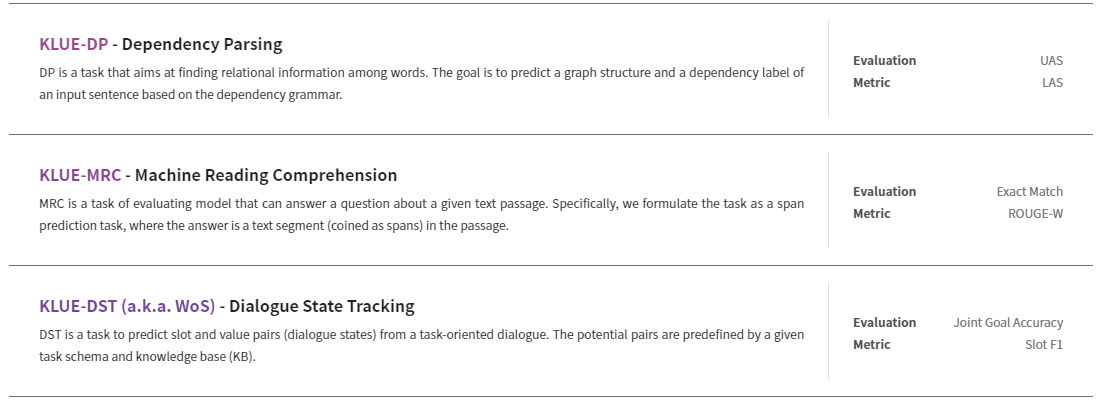 3) KLUE(Korean Language Understanding Evaluation) : 나온지 그렇게 오래되지 않았습니다. 여러 기관들이 주축이 되어 만들었습니다.