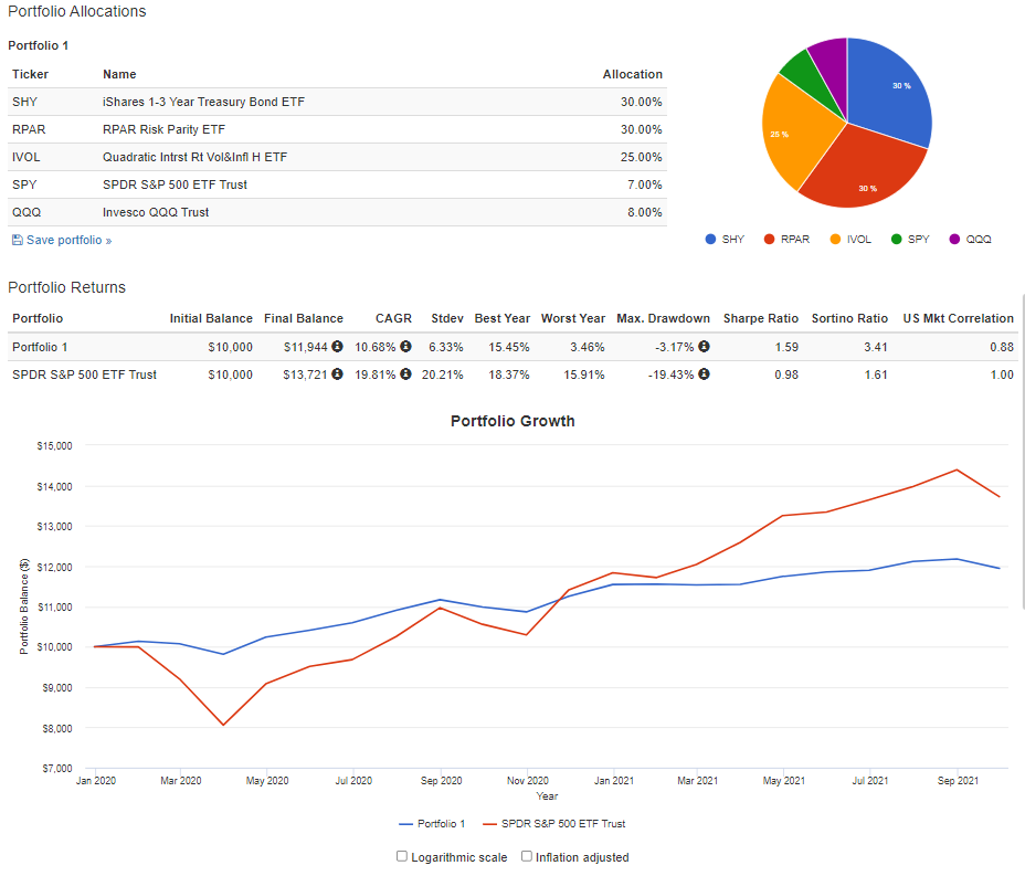 첫 번째는 방어형 컨셉을 지닌 포트폴리오 전략입니다. 참고로 RPAR이라는 올웨더 포트폴리오 ETF가 2019년에 상장된 신생 ETF이기 때문에 기간이 짧은 것이 단점입니다. 또한 이 포트폴리오는 MDD가 상당히 작지만 벤치마크인 SPY를 이기진 못합니다. 그래도 리스크 대비 수익은 좋은 편입니다. 아마 제가 은퇴를 하거나 부모님 계좌를 굴린다고 생각한다면 이렇게 운용해봄직하다고 생각합니다.